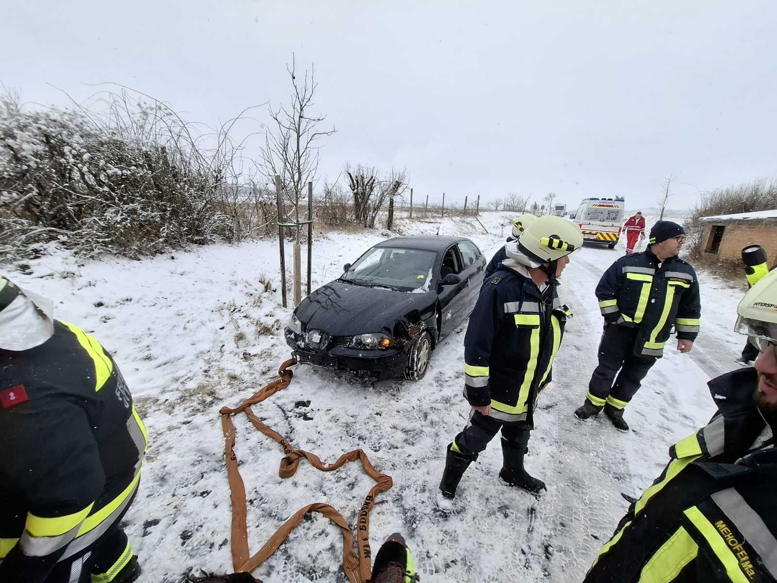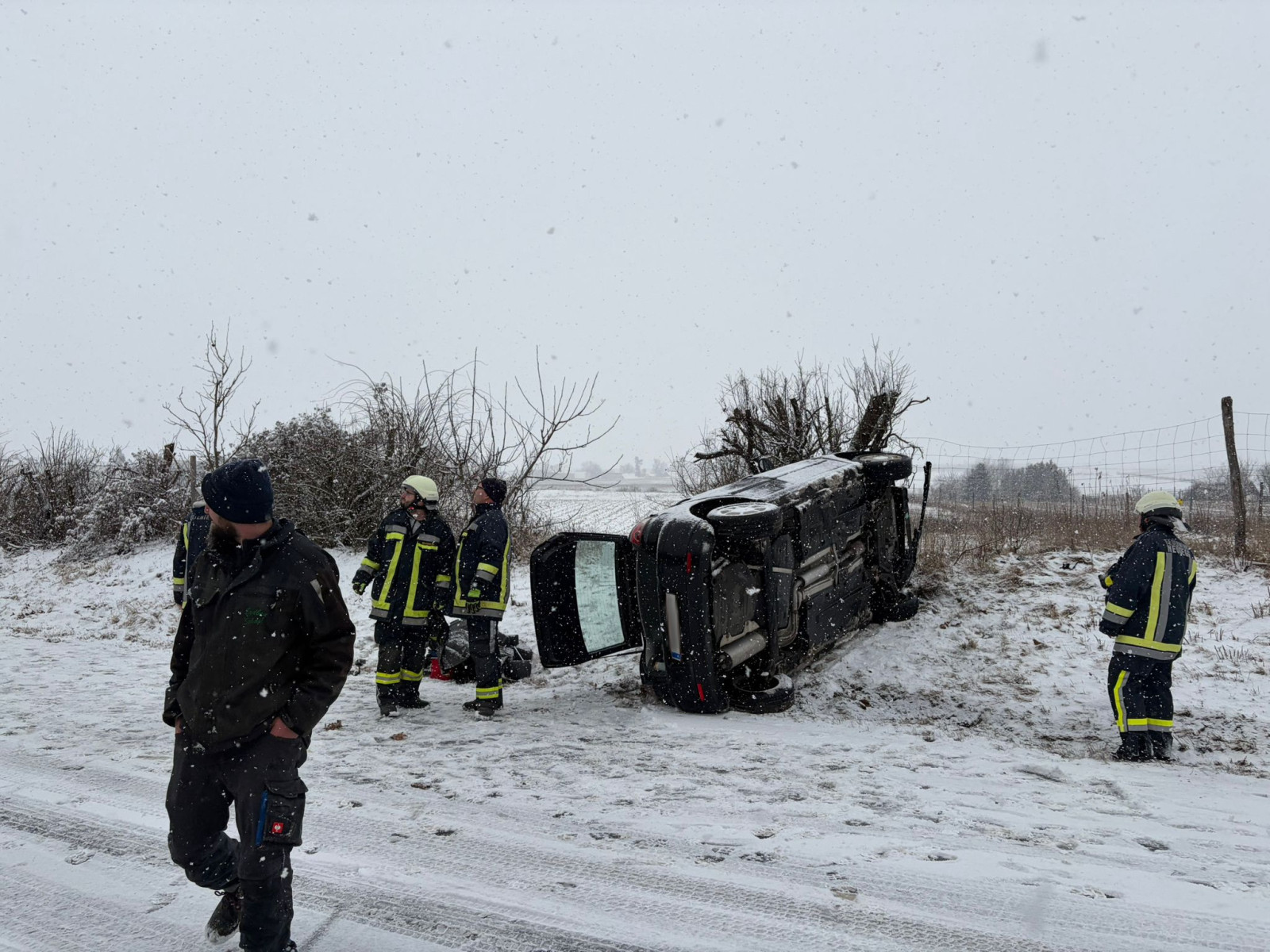 Beim ersten Einsatz, alarmiert um 11:57 Uhr, handelte es sich um einen T2-Verkehrsunfall mit Menschenrettung zwischen Großriedenthal und Hohenwarth. Aufgrund der Schneefahrbahn kam ein PKW von der Straße ab und blieb auf der Seite liegen. Glücklicherweise wurde dabei niemand verletzt.
